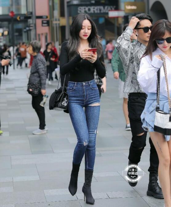 下图的这套穿搭就是一件黑色的紧身上衣,上衣带有一点小V领,然后下装是一条紧身的深蓝色牛仔裤,左腿大腿部位还有破洞的设计,脚上再一双黑色中筒高跟靴,整个装扮也没有过分的修饰,也没有夸张的配饰进行装点,但就是美的无可挑剔,性感又很有气质,真的超级女神。所以我们知道了,一条紧身裤对打造女性气质有多重要。真的很推荐微胖女孩去选择一款紧身的牛仔裤来穿,会很有女性韵律。