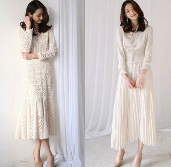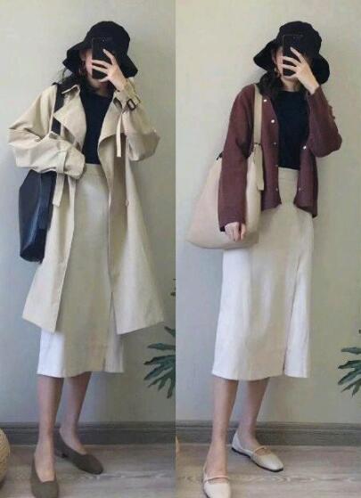 我们看看下图的两套穿搭。第一套是一件黑色的内搭,搭配一套白色的半身裙,外面一件浅卡其色的风衣外套,脚上一双咖色的裸跟豆豆鞋,整个装扮就超级气质淑女,当然这种上身的搭配也是女汉子转型女神的穿搭示范;第二套则同样的黑色内搭加白色半身裙,然后外套换了一件暗红色的短款开衫,然后脚上一双米色的玛丽珍鞋,整个装扮真的超级有office lady的气质淑女风,而且超级精致少女。
