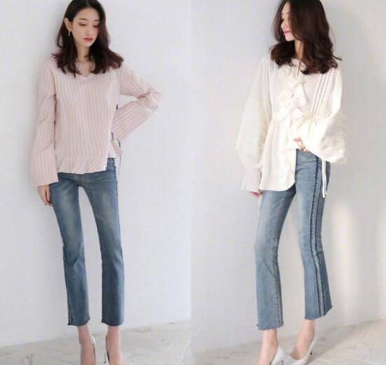 下面的两套穿搭都是采用了一条微喇型的牛仔裤进行搭配。第一套是一件粉色系的竖条纹宽松版的衬衫,然后搭配一条浅蓝色的微喇型牛仔裤,脚上一双白色高跟鞋,整个装扮就很有韩系小姐姐的风格;第二套则是一件米白色稍有设计的衬衫,袖子是肥肥的灯笼袖,衣身胸前还有两个大大的蝴蝶设计,然后下装则又是一条浅蓝色的微喇牛仔裤,脚上依然是一双白色高跟鞋,这个装扮也超级有淑女气质的风格,而且这种牛仔加衬衫的装扮属于很简约也很容易搭配的方式。即使不修边幅的女汉子形象也可以轻轻松松打造出淑女气质范。这几套穿搭如果不要太喜欢穿高跟鞋的话,换成帆布鞋也可以,只是帆布鞋的感觉会偏休闲气质一些,而高跟鞋则更有一种高冷的气质淑女感,因人而异,看个人喜好。