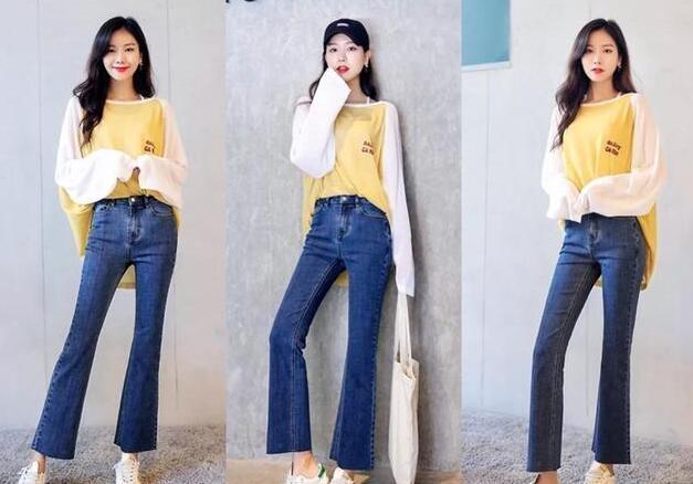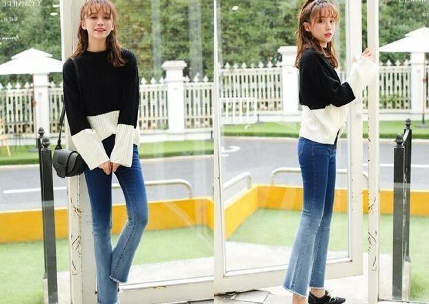越来越流行复古风,这条喇叭裤就是80年代就开始流行的,现在又开始火起来了,在2019春季就很流行穿九分喇叭裤哦,它是渐变色的牛仔版型设计,看起来就足够有范儿,上衣再搭配黑白针织衫,看起来超级有时髦感,学生党这样穿很美!