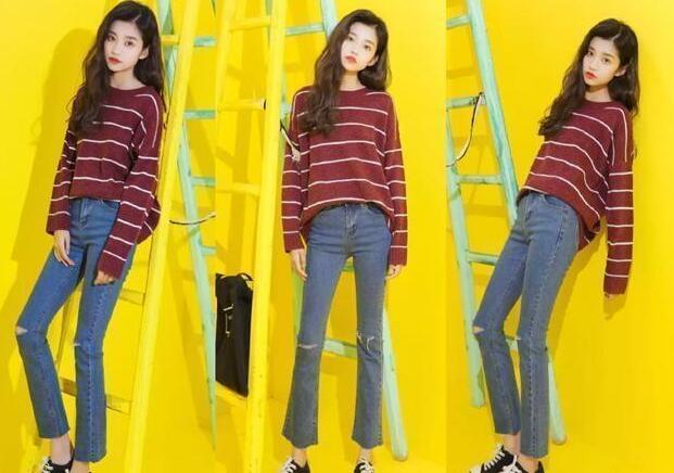 这条是破洞设计的牛仔喇叭裤,优雅的喇叭裤又让你的脚型变得更加好看,九分的设计尽显大长腿气息,更适合那些腿短或者个子不高的女生,内搭红白条纹t恤时尚又好看,再搭配黑色运动鞋很是舒适,重点是还不挑人穿哦。