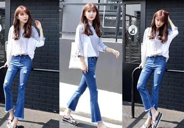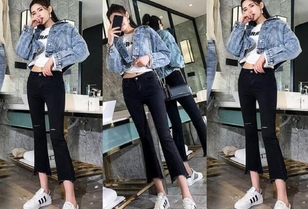 今年流行的喇叭裤,喜欢时髦的你,这款破洞设计的喇叭裤应该是你喜欢的,九分喇叭裤配什么上衣好看?上身潮流感满满的黑色的颜色在视觉上还是会疼的显瘦,上衣搭配一件白色短裤t恤露出细腰更显高了,外套选择了青春的牛仔外套 ,在早晚温差大的时候可以保暖,同样短款的设计真的好看不得了!