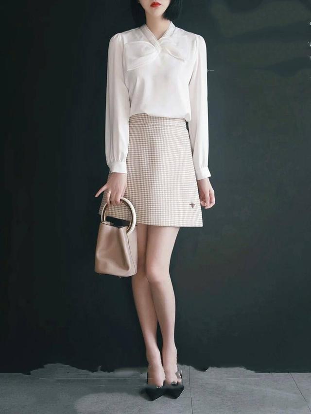 厌倦了长裙的束缚感,可以尝试下短裙的干净利落。A字裙流畅利落,搭配浅色千鸟格的图案,简约干净,长袖的雪纺衬衣,领口处的大蝴蝶结,给整套look增加了甜美清新的味道,搭配精致小巧的圆环手包,甜美干净的女神气息油然而生,适合皮肤较白的女性,显高又甜美。