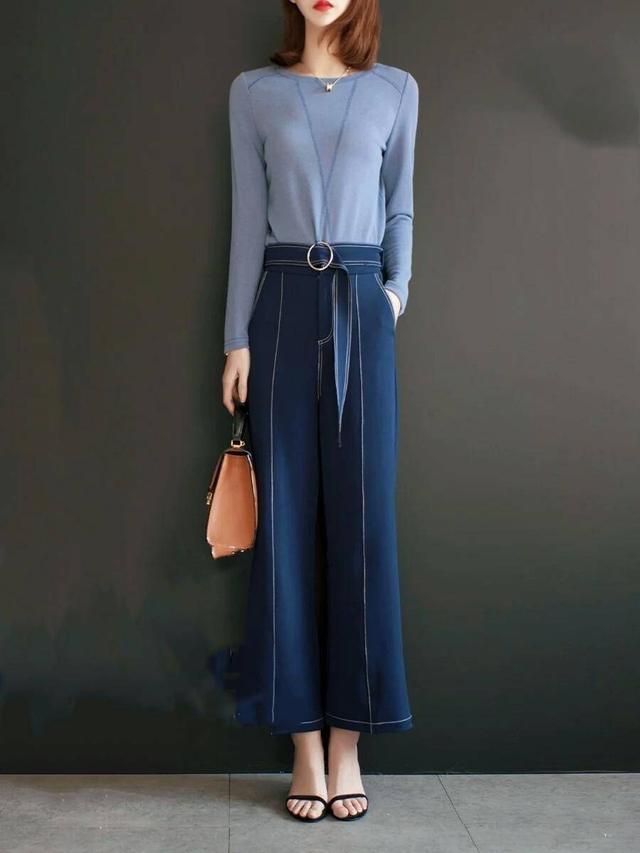 复古蓝的直筒裤搭配雾霾蓝上衣,上衣深蓝色的V字暗纹配合裤型上的白色封边线,打造了长裙才能带出的流畅感,适合喜欢裙装的职场女性,时尚干练又有裙装的温柔气质。