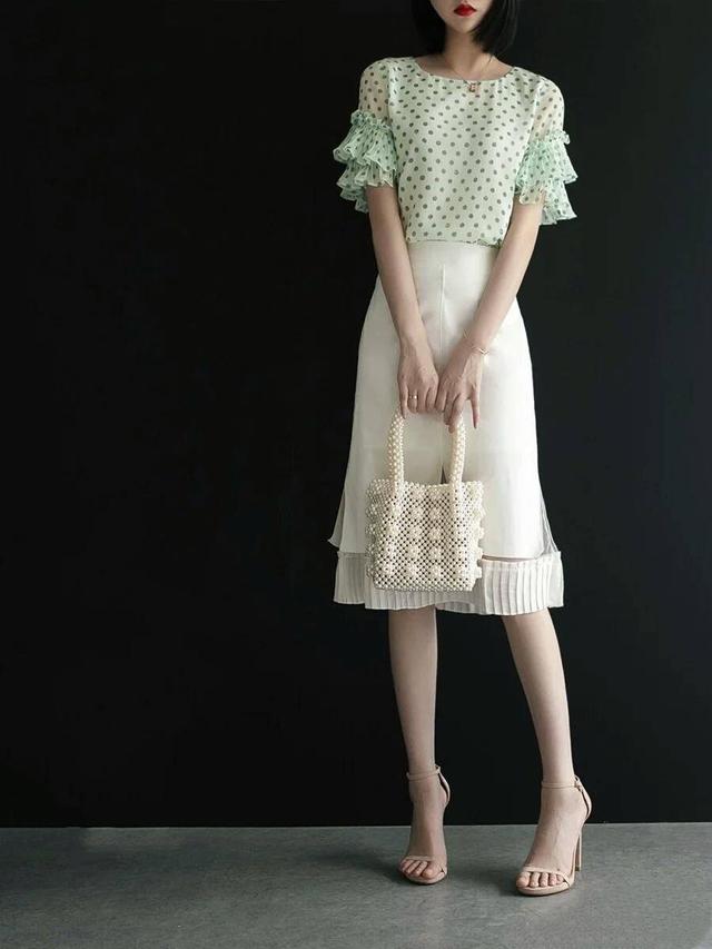 除了荷叶边和流苏,圆点也是非常适合熟龄女性的元素。浅绿色的雪纺衬衣搭配修身高腰裙,上衣中排列整齐的圆点,丰富了过于单调的穿搭配比,而波尔多圆点的优势在于,不仅图案精致,还能在视觉中营造圆润感,适合身材娇小的女生选择,清新又时尚,富有女人味。搭配屋。