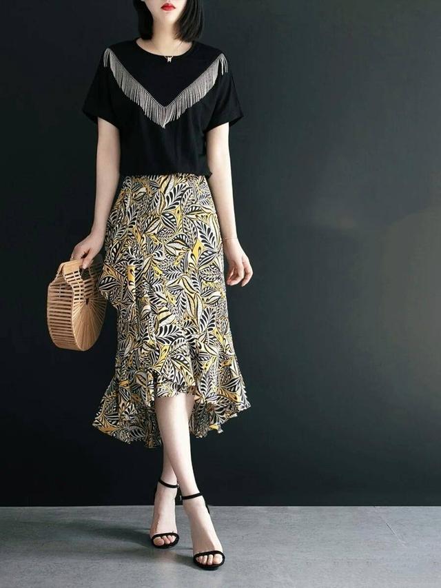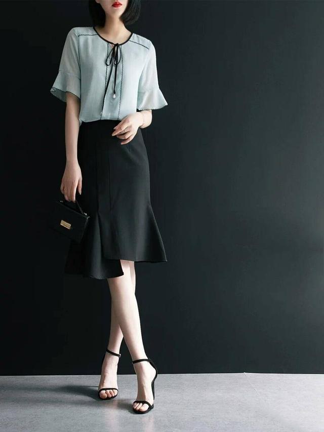 不同于经典款的柔软流畅,这款裙装的独特之处在于裙摆,不规则的裙摆剪裁加上荷叶边的设计,中长款的裙装露出优美的小腿曲线,纯黑色更是显白利器,搭配水蓝色的雪纺上衣,温柔知性不失时髦感,微胖身材的女生也可以放心搭配。