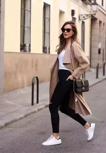 一件长款的风衣,卡其色的色调,让你在这个春天看上去时尚又大气,宽松版的风衣还能够很好的为你遮掩住身上的赘肉,更好的秀出你纤细的双腿。穿搭风衣的时候下半身搭配一条小黑裤,让你看上去更加的有形,走起路来都带着风。时尚服装,