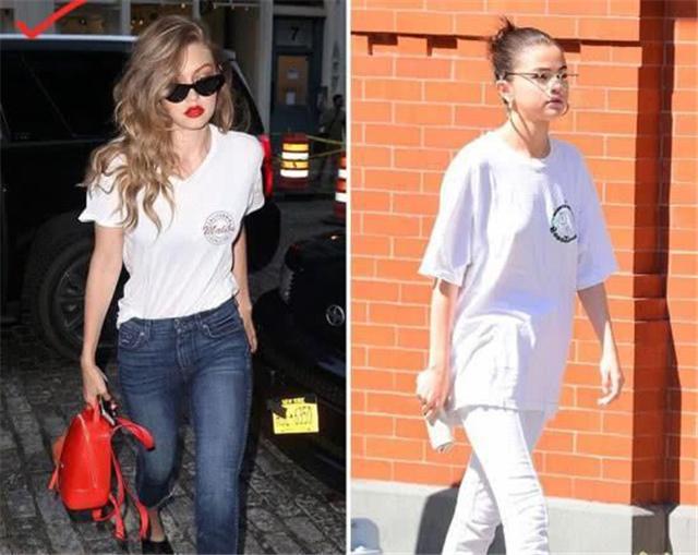 举个例子,图中的两件T恤由于领口设计得不同,瞬间给人的气质和感觉也就不一样了,圆领的T恤就使得模特的整体气质看起来非常的拘谨,而V领则显得更加的有气场一些!