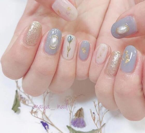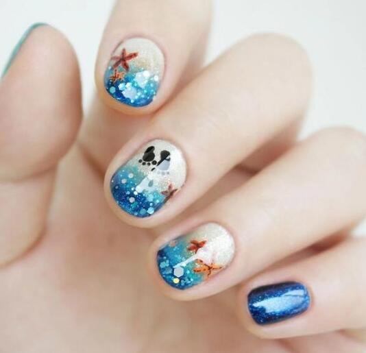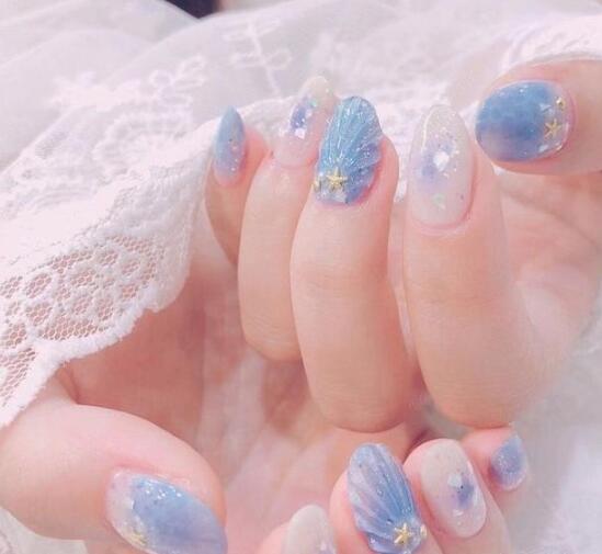 蓝色贝壳甲,特别小清新的一款,用了一定的晕染技术,比较适合春夏的时候做,加上一些亮片的点缀,真的太浪漫了,尤其是穿一身白裙漫步海滩的时候,和这个指甲简直绝配!