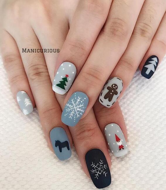 圣诞甲也不一定非得是红色,这个磨砂的冷色调莫名有一种非常个性的独一无二的感觉,而且是磨砂质地的看着会更加高级,雪花,圣诞树,圣诞老人等等元素也是超级丰富的。