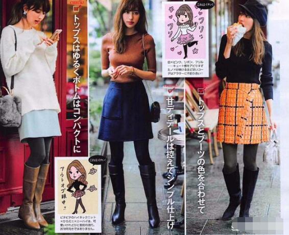 半裙的时髦穿搭,一定要跟及膝长靴搭配,黑色及膝长靴+蓝色A字裙+焦糖色毛衣,显腿长又遮肉,棕色过膝长靴+浅蓝色半裙+长裤白色毛衣,搭配毛球包包,还有冬天温暖的感觉。