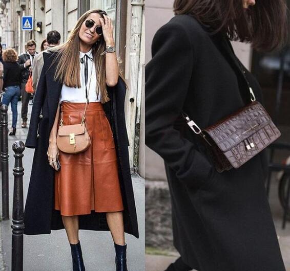 黑色大衣是冬季必备单品,搭配焦糖色的皮裙,内搭白色衬衣,内短外长,视觉上营造大长腿既视感,搭配黑色裸靴,酷范十足。