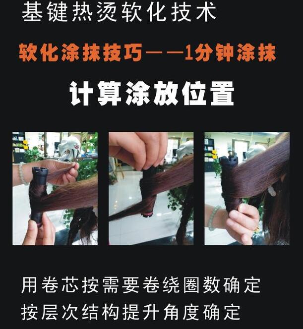 涂抹软化的时候,先把发片提拉到发型层次裁剪时的角度,然后把发片放到虎口处,用拇指控制涂抹的位置,防止涂抹到不需要烫的头发上。然后再把发片绕在食指和中指之间,先把软化涂抹在手心,再把头发全部放到手心,涂抹软化,这样上下就都有软化了,只需要搓揉一下,向下顺带一下,用梳子梳一下,软化就可以涂抹均匀。拇指一定要控制好,防止软化涂到上面。这样操作,1分钟左右全头涂抹完成。
