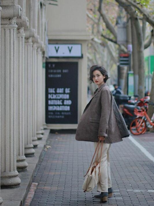 小领子的设计能体现出女人性感的脖子与优美的脸庞,用白色的圆领毛衣做内搭,显得干净又整洁。把毛呢外套的袖口设计成喇叭的造型,可以让纯白色毛衣内搭的袖子被露出来一截儿,形成层次感强烈的搭配,喇叭袖也更显潇洒气质,穿一条与内搭同色的阔腿裤,很有整体感,还能起到显高显瘦的作用,整体效果优雅又时髦。