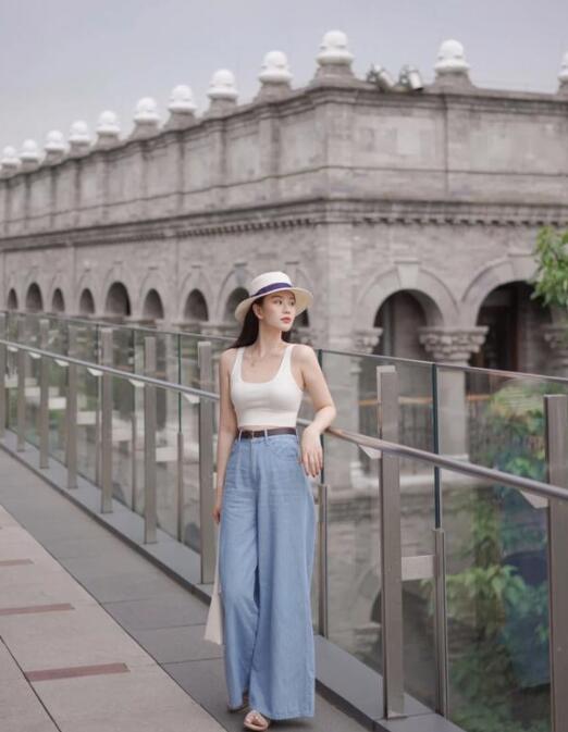 下身搭配了一条高腰款的蓝色牛仔阔腿裤,阔腿裤宽大的裤腿穿起来不仅清爽舒适,同时又能够修饰腿型,搭配屋。特别适合梨形身材的妹子。上短下长的穿搭无形中拉长下半身线条,让身材比例看起来更加完美。同样是搭配了一顶白色礼帽,洋溢着法式气息。