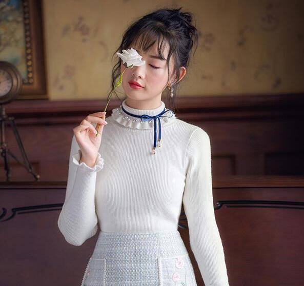想留下窈窕淑女的形象,那入手这款针织衫是不错的选择。它那花边领加上精美的珠子,传递出浓郁的复古韵味;撞色的蝴蝶绑带,打造窈窕淑女形象;花边袖与素雅的色彩格调,又多了几分文艺气息,内搭外穿都很美~