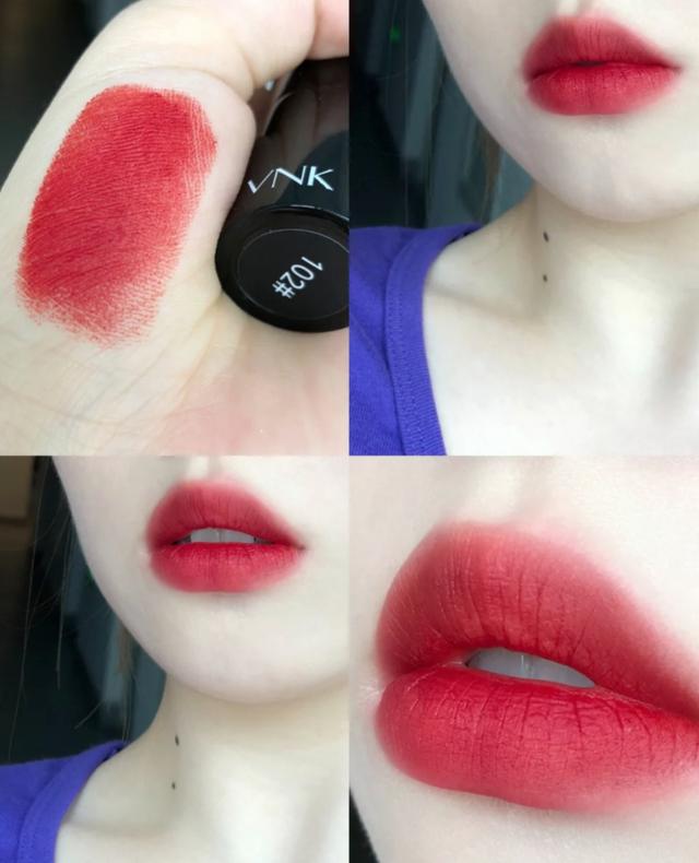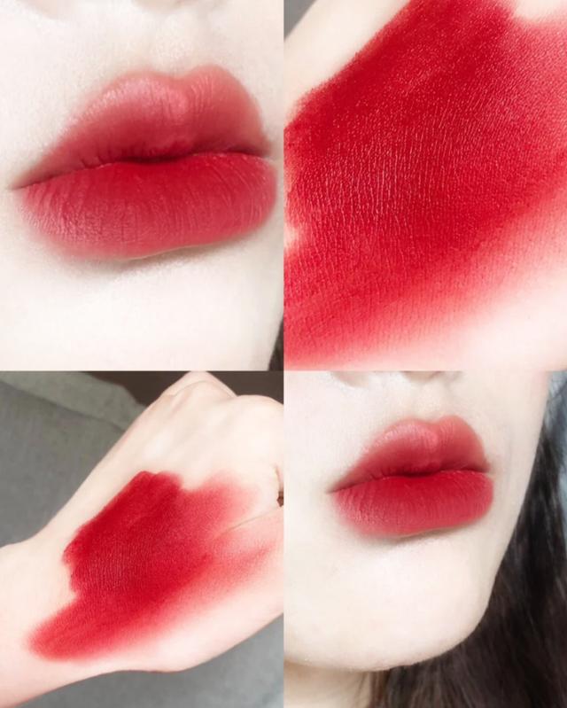 这个颜色真的巨显白,对黄皮也是非常的友好,在平常的时候比较适合化淡妆或者素颜的时候涂抹,真的非常好看,颜色是明亮的苹果红,带橘色调,但是不会荧光,上唇会非常衬肤色,薄涂的时候有点偏橘调,比较日常,厚涂则是颜色非常浓郁的苹果红,显肤色也显牙白。它是属于哑光的质地,稍干,所以上唇建议先做打底,雾面哑光的质感超显高级,持久度还不错。