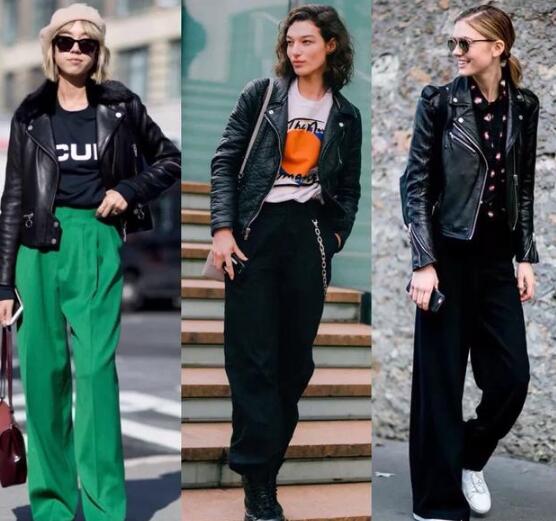接下来是皮衣外套与裤装的搭配。作为一名身材娇小的女生,显高是我必须要顾及的,所以我比较喜欢用短款皮衣外套搭配高腰裤,这样穿出来很显瘦显高,而且风格偏休闲街头感。今年比较流行长及脚面的裤子,与短款外套搭配起来,非常的显高,搭配一双可以增高的老爹鞋,还能隐形增高几厘米。