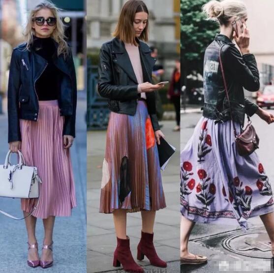 首先是小皮衣+半身裙的组合。小皮衣搭配什么好看每次到换季,我还是舍不得换掉美美的裙子,这时候搭配一件小皮衣外套,就可以穿的又仙又保暖啦。黑色皮衣外套+黑色高领衫+粉色百褶裙,鞋子搭配与裙子同色系的尖头高跟鞋,是不是有种小仙女的感觉?皮粉色打底衫+印花百褶裙,搭配酒红色靴子,既有女生的温柔,也会展现出很率性休闲的一面。