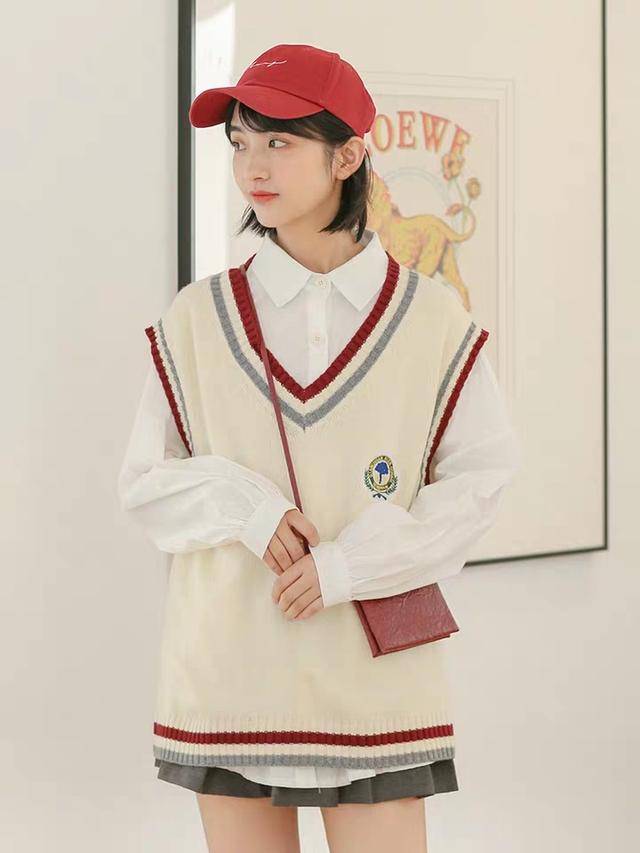这是一身学院风格非常浓郁的搭配,毛衣的整体颜色是米白色的,在领口和袖口的地方有红灰色的条纹装饰,让看似简单的毛衣多了一份设计感。里面搭配的白衬衣就是一件非常普通的衬衣,并没有什么特殊的地方。