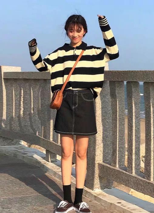 下身之所以选择黑色的牛仔半裙也是为了和毛衣的颜色相呼应。我们在穿的时候可以把毛衣的衣角塞进裙腰里面,这样会在视觉上营造一种大长腿的感觉。脚上穿一双普通的黑色帆布鞋就可以了,袜子的话我们可以选择小腿袜,因为这个长度的袜子可以修饰我们小腿的线条,让我们的小腿看起来更细一些。