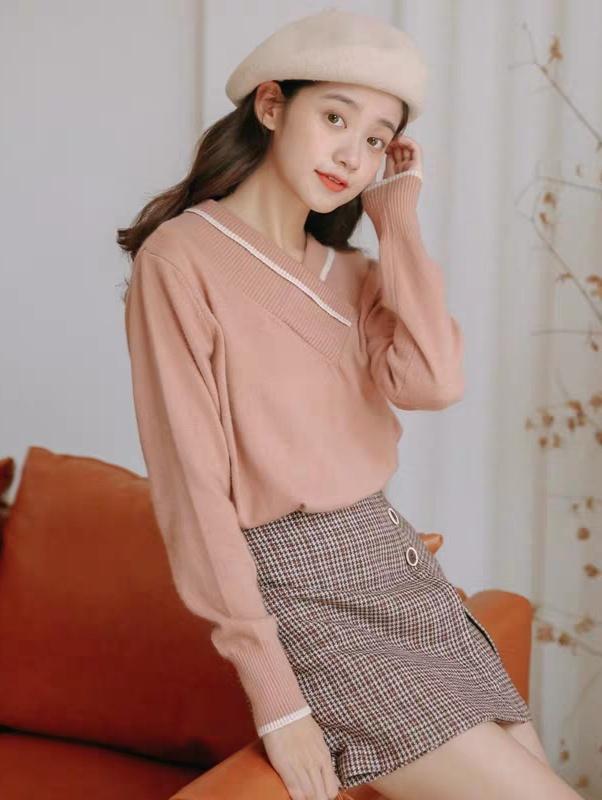 藕色一直都是一个非常温柔的颜色,这一身的搭配就很好地向我们诠释了到底什么是温柔如水。毛衣是一个拼接的V领的设计,比普通的V领多了一些特殊的感觉。而V领本身就可以很好的修饰我们的脸型,可以让我们的脸看起来更小一些。
