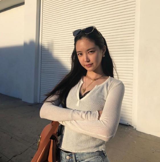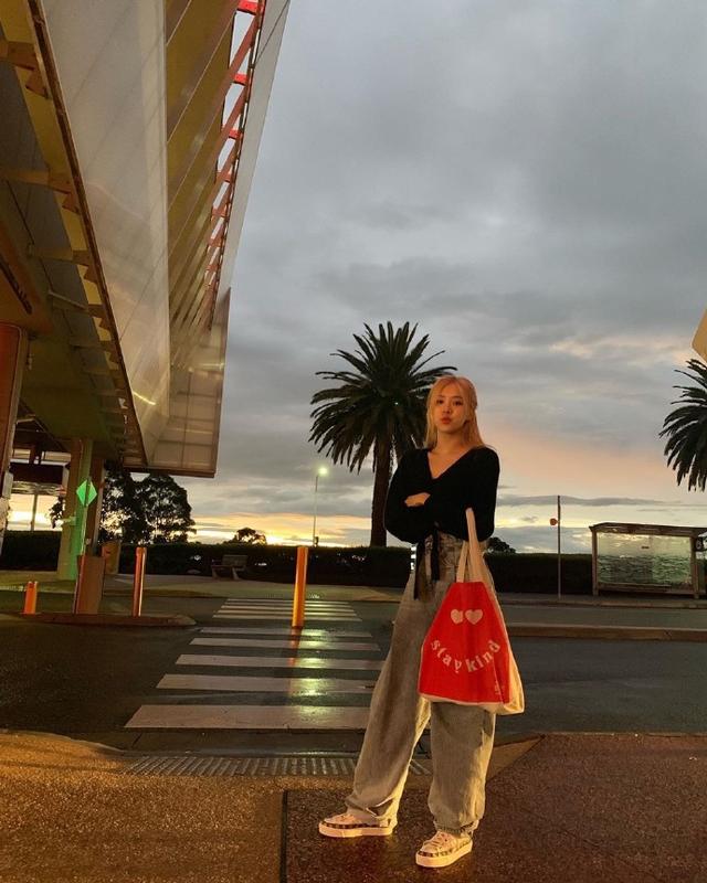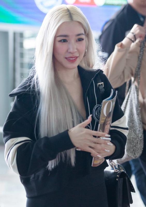 说实话韩国女团普遍的金发是把双刃剑,一不小心就会显廉价。发色很浅所以搭配这套偏深色系的运动套装,很好的中和了视觉效果。运动风在机场秀中也是不错的选择,黑色与白色混搭的运动衫休闲又显活力,特别适合这个季节。