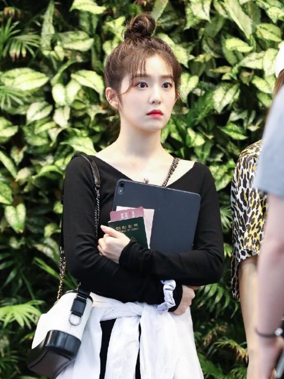 Irene一直都是韩国有名的冷艳美人,就算是扎高丸子头也是高冷模样。这款黑色宽领长裙真的是气质杀手,黑色自带高冷疏离感,加上v领设计展现天鹅颈凸显性感诱惑!腰部可以用白色外套作为装饰,增添几分休闲感。