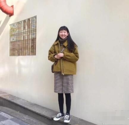 图片中的小姐姐简直是治愈系的美少女呀~笑的特别甜。搭配衣服也搭配的满满元气风,这套衣服也是必备呢。跳出了以往的黑白灰三大色系,姜黄色给人一种温暖的感觉。在搭配格子小包臀裙和帆布鞋,真是典型的元气风搭配~犹如冬日的一抹阳光给周围的人带来了温暖。