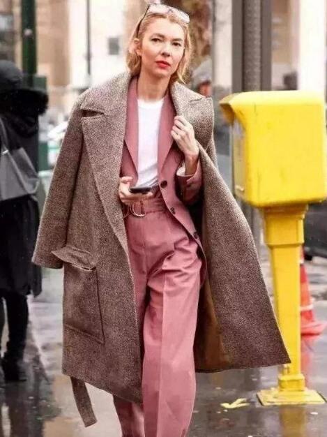 这个颜色的西装套装单穿就很有韵味了,秋冬季节叠穿大衣,既时尚又保暖。当然,我个人认为搭配深色的大衣会更显高级感。