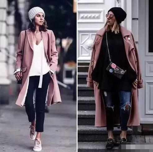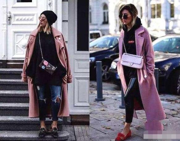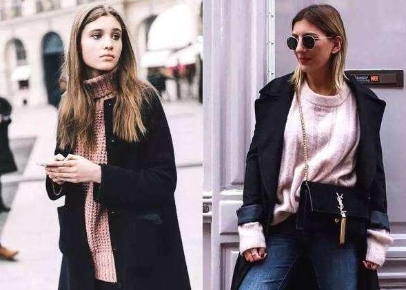 秋冬季节黑色大衣是首选之一,但确实有点沉闷,搭配当枯玫瑰色毛衣,整体搭配变得明亮,大面积的深色加上小面积的浅色,所以让整套高级感十足。