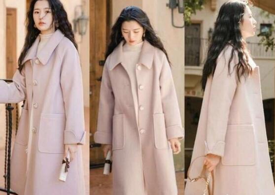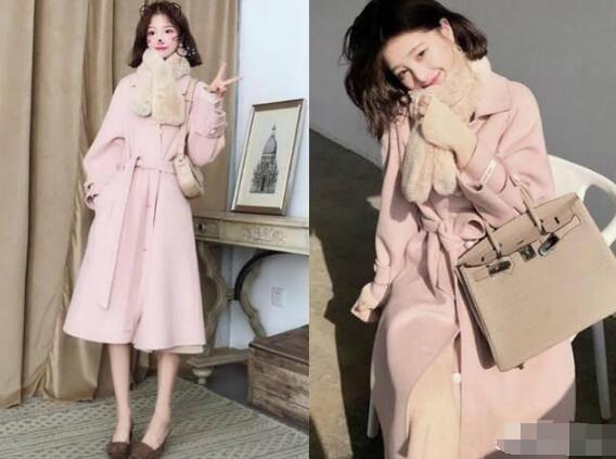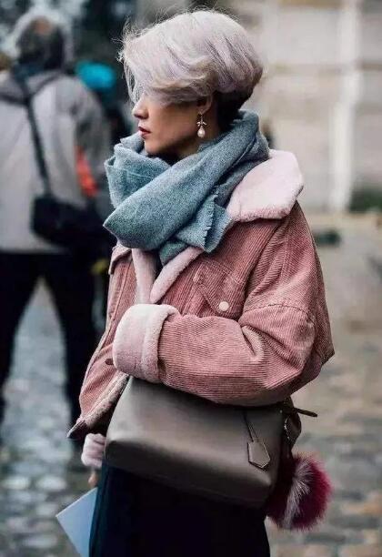 偏粉的玫瑰粉色大衣搭配一条米色围脖,有点甜美的一套搭配,跟前面的搭配相比,多了一丝小女人味儿。