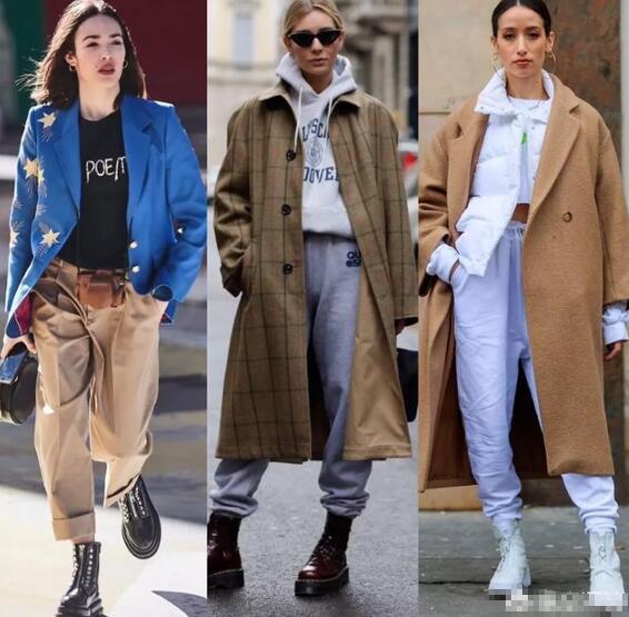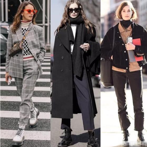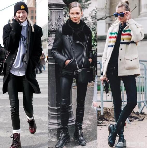 先说一下下装的选择吧。首先是裤装的搭配:紧身的裤装与宽松BF风的裤装给人的视觉感受是完全不同的,一个中规中矩,一个随性自然。衣橱必备的基础裤装—小黑裤,与马丁靴搭配,会把腿部衬托的更加细长,而霸气修身的黑色皮裤与马丁靴搭配,更是干净利落,酷到飞起。