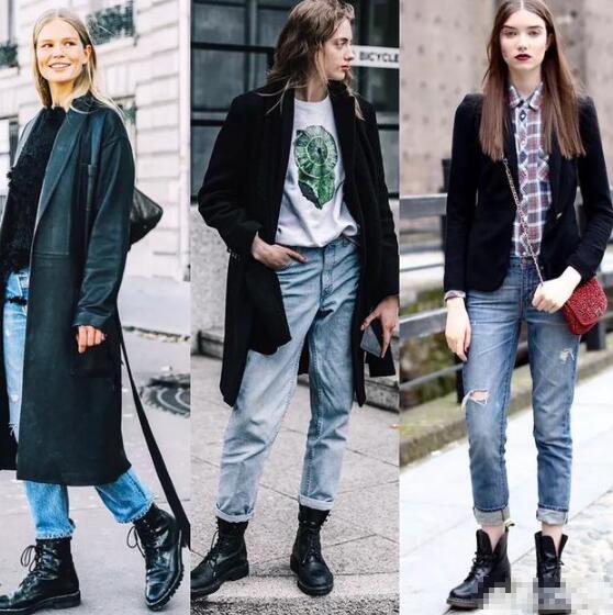另外,自带休闲属性的牛仔裤与马丁靴搭配,也是比较常见的基础搭配,潮范十足。九分直筒裤与马丁靴搭配,是我个人比较喜欢的组合,可以露出一部分袜子边边,下装的搭配会变得很有层次感,而且显得小腿细长。