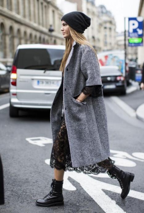 灰色大衣一向是被称为最有高级质感,要想与之搭配,就要选择黑色,谁让它们是最佳的CP呢?而穿上黑色蕾丝裙,扑面而来的性感,这身搭配非常的适合高个子,能够尽情的展现高挑的身材。这样子的搭配走在街上,回头率一定是很高的。