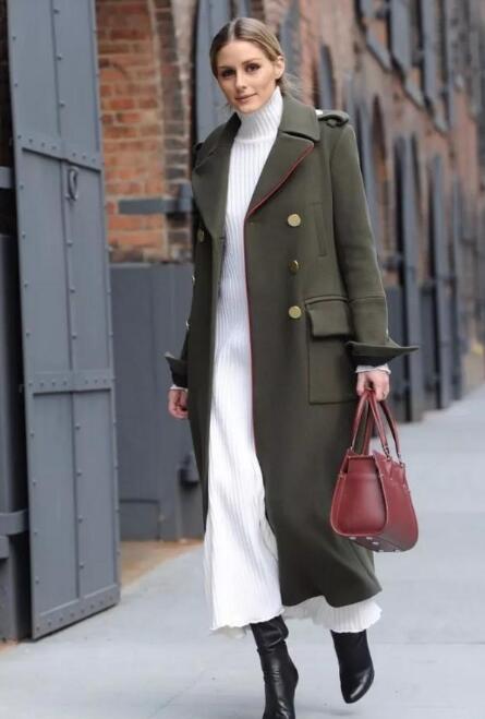军绿色的大衣,其实没有想象中的那么难以hold住,大衣要搭配什么衣服好看而内搭选择白色针织裙,白色本身就很显肤色,也就减轻了军绿色的单调乏味。