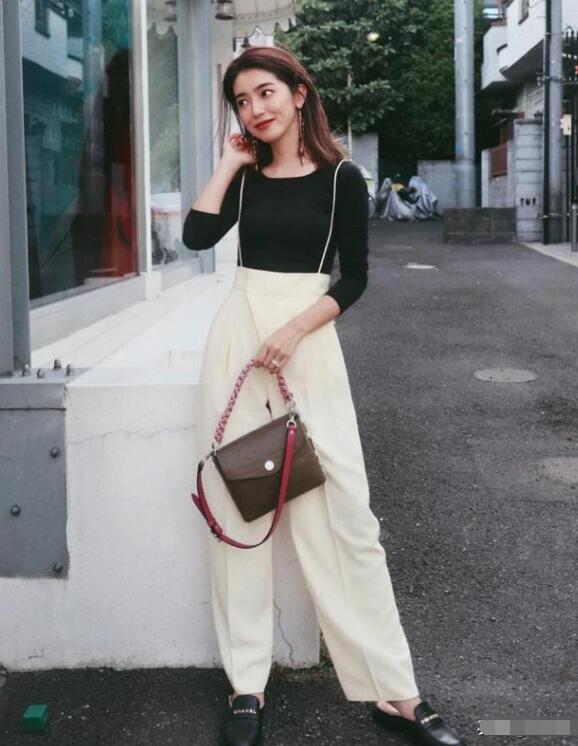 在这套搭配中,博主上身选择的就是一件黑色短款长T,这种款式的上衣很适合小个子女生,显瘦又显高,下身搭配了一条杏色的高腰背带阔腿裤,视觉上又能够增高几公分,整套搭配简约舒适又显得很有时尚感。