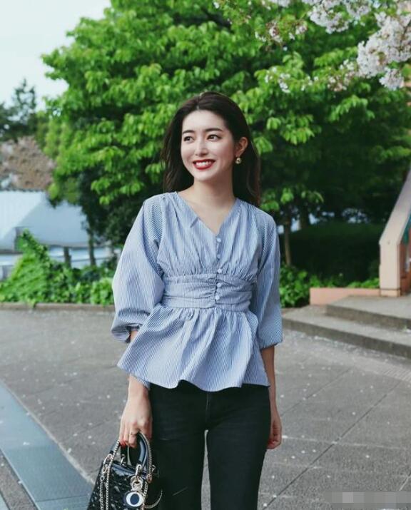 对于小个子女生来说,腰线就是整套搭配的灵魂,所以小个子女生在日常穿搭中一定要重视提高腰线。在大口智惠美的日常穿搭中,经常可以看到高腰款的单品。就像这款浅蓝色的格纹上衣,本来就是短款的长度,再加了高腰的设计,显高效果就更明显了。下身搭配一条深蓝色牛仔小脚裤,整套搭配既显高又显瘦,又能够穿出清新时尚感。