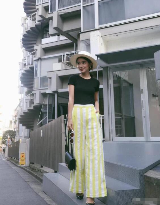 高腰款的下装也是她日常很喜欢穿的单品。高腰款式的下装与短款上衣性质是一样的,都能够提高腰线,能够延长腿部线条。在这套搭配中,她选择的是这条高腰款的条纹阔腿裤,穿上身特别显腿长,上衣选择的是一件简单的黑色T恤,将衣服塞进裤子里面,更加凸显腰线。