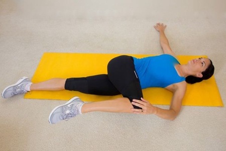 1、后背平直躺在地垫上,双臂放在身体两侧,双腿自然伸直。收紧腹部和臀部的肌肉群,慢慢的唿吸,然后将右腿向上弯曲,并且尽可能的靠向腹部。保持三个深唿吸。