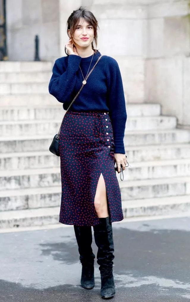 当然,如果你腿型不够完美或者是小腿肉肉比较多,中长款的A字裙绝对是一个不错的选择。中长款A字裙可以完全遮住我们不完美的腿型,会更加显高显瘦。不过对于中长款的A字裙,长度的把控也很重要,一定不能选择超过脚踝的长度,不然就会显得邋遢不利落。