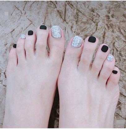 时尚气息真的很足了,就算是配上一双简单的拖鞋都可以显露出很高级的感觉。方块亮片的拼接可以说是非常的用心了,左边和右边的大脚趾都是不一样的排列方式,设计感很强,两边都是中间的脚趾做了闪粉的跳色,整体和跳脱都在这个美甲里面体现出来了。