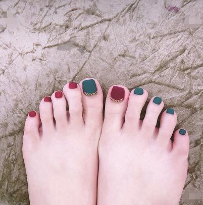 看上去很简洁,但是简洁当中又有着一些时尚的设计感。暗红色和墨绿色都是特别显白的两个颜色,左右两边虽然都是相同的色调,但是在每一个脚趾的颜色上面做了对调,不普通的感觉马上就体现出来了。两只大脚趾上面的金链子挂饰跟整体的颜色也是特别搭调的,还增加了不少高级韵味。