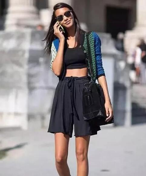 当然,选择高腰款也是个不错的选择,其实有些不是高腰款也可以当高腰款,百慕大短裤的裆部都比较深,所以将裤腰拉高个三五公分都不是问题,反而提高了腰线,更加有利于显腿长。