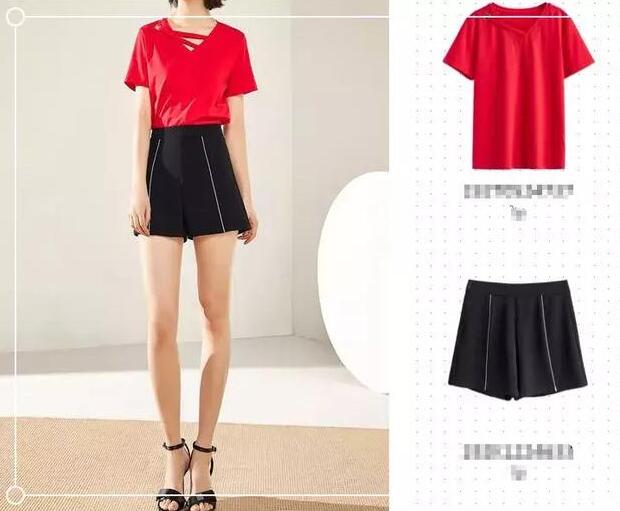 简单的高腰短裤是夏季轻熟风中最省心的单品,下半身是黑色高腰设计的短裤,宽松的裤腿拉长腿部比例,呈现出显高的既视感,然后将上衣红色亮眼吸晴的T恤扎进裤腰里,这样会让你看起来更加有精神干练的感觉哦。