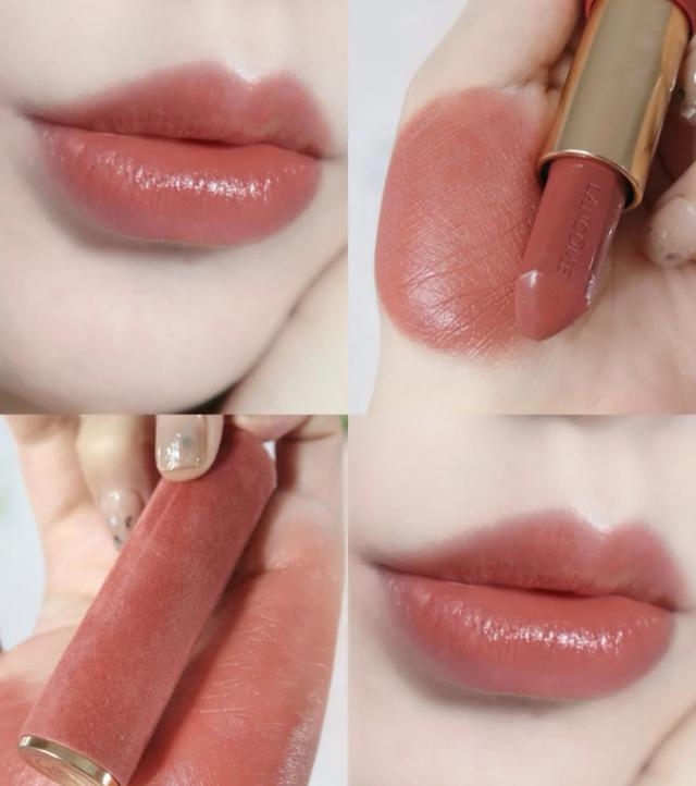 兰蔻274这款口红也是今年早春时节比较流行的一款色号,主题色是带有棕色调的蜜桃奶茶色,涂在嘴上有一丢丢肉桂圆的感觉,十分水嫩。另外,这款口红的颜色和唇部的颜色比较吻合,涂在嘴上效果非常明显,可以凸显整个人的气色,而且非常显白。