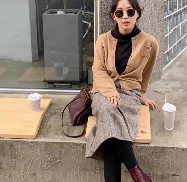 卡其色是一个非常耐看的颜色,毛衣外套用卡其色的色彩,裙子就用卡其格纹色系的半身直筒裙,色彩统一,有韩风的感觉,而我们选择眼镜的时候也是比较好选的,因为服装款式非常百搭。同样是圆框的设计线条,会稍微比方的更加流畅,小姐姐的脸型是瓜子脸,戴上圆的墨镜显得优雅柔和。