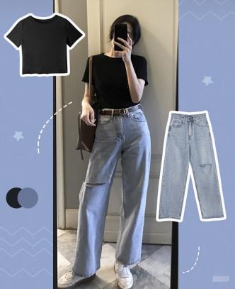 这一套的搭配,既显瘦又能显腿长,一点也不挑场合穿。黑色的衣服是所有类型的衣服颜色中最显瘦的一种,简约的黑色短袖T恤给人酷酷的感觉,如果觉得单调的话可以配一条金属链子作为搭配哦。泫雅风浅蓝色破洞阔腿牛仔裤,时尚大方,阔腿裤能够把整个腿部的缺陷完美的掩盖,微胖的小仙女必选哦~