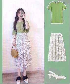 清新的芥末绿色短袖真的超级甜,清纯活泼,满满的夏日气息。T恤是七分袖的设计,宽大又凉爽,最重要的是可以遮挡住手臂的肉肉。搭配上设计感十足的小碎花半裙,长度恰到好处的露出腿部最细的部分,校园甜美气息扑面而来,是很日常的一款百搭邻家女孩的搭配哦~