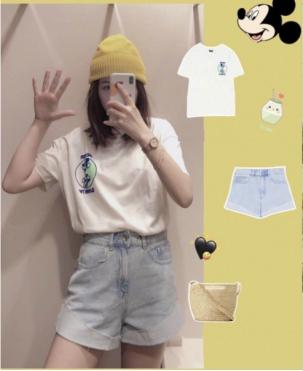 超级可爱的一套搭配哦,虽然款式和配色都是比较简单的,但是因为添加了一些可爱的细节处,所以让人看起来很舒服。上衣胸前的荧光绿印花非常惹眼,衣服是米白色的,在室外有一种阳光的味道~质感非常的好,牛仔短裤也有一点点阔腿的感觉,穿上会显得大腿的部分比较宽松,很显瘦。